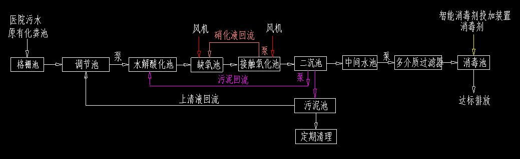 污水處理水源為醫院廢水,經過院區內的排水管匯集經過化糞池后進入醫院污水處理設備。